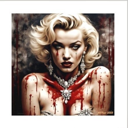 MARILYN MONROE "BLOOD and DIAMONDS" is een Artwork gemaakt met oude en nieuwe technieken zoals ARTIFICIELE INTELEGENTIE , ACRYLVERF , FOTOGRAFIE EN GRAFFITI verderop staat het hele proces beschreven