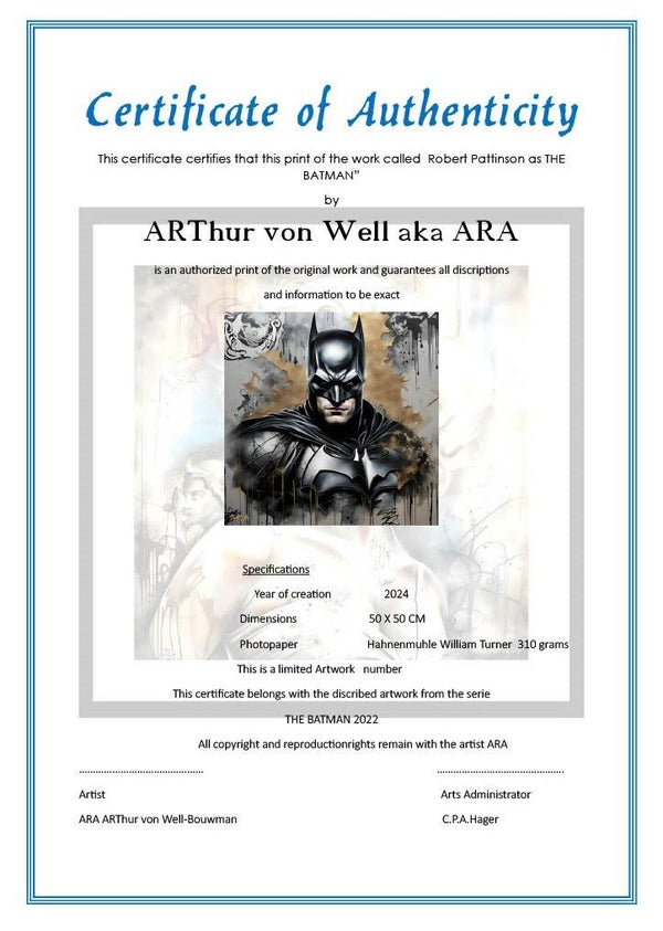 op de achterkant het nummer en uitgebreide informatie plus een door de kunstenaar ondertekend certificaat. Het is mixed media-kunstwerk en is gemaakt met behulp van AI, acrylverf, inktpennen en bewerking op een grafisch tablet. Samen met fotografie een werk van de opkomende kunstenaar ARA, die zijn werken in heel Europa en Amerika (NY) al heeft verkocht aan verzamelaars voor hun privécollecties, galerijen en ook via het web en CATAWIKI.